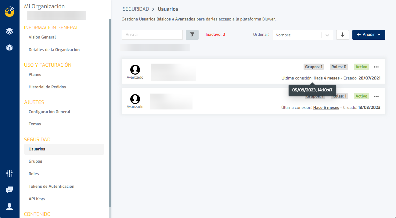 Para consultar la actividad de un usuario y ver su último acceso puede ir a la zona de administración de Biuwer, en el apartado Seguridad → Usuarios. En esta zona aparecerá el listado de usuarios de su cuenta con la información de la última conexión de cada uno de los usuarios. Si pasa el ratón por encima de la zona “Última conexión” verá la fecha y hora de la última conexión del usuario.