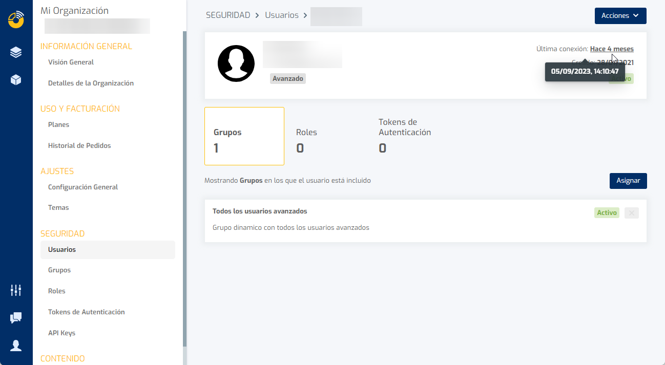 También puede ver esta información en la ficha de cada usuario. Si accede a un usuario en concreto verá en la parte superior derecha la sección “Última conexión”.